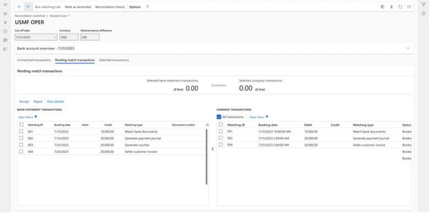 Finance teams will also benefit from previewing automatic bank reconciliation matching results before postings are finalized. This feature allows users to review, approve, or reject matching outcomes generated by reconciliation rules, ensuring higher accuracy and reducing the risk of incorrect postings. By introducing a structured review step with a dedicated pending-review screen, organizations gain better control over cash reconciliation while still benefiting from automation.