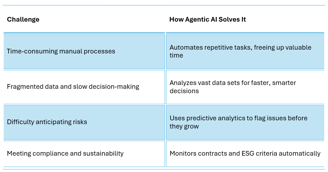 - Easy compliance & sustainability: AI can help track contracts, monitor ESG criteria, and keep you on top of regulations with less manuel effort.
